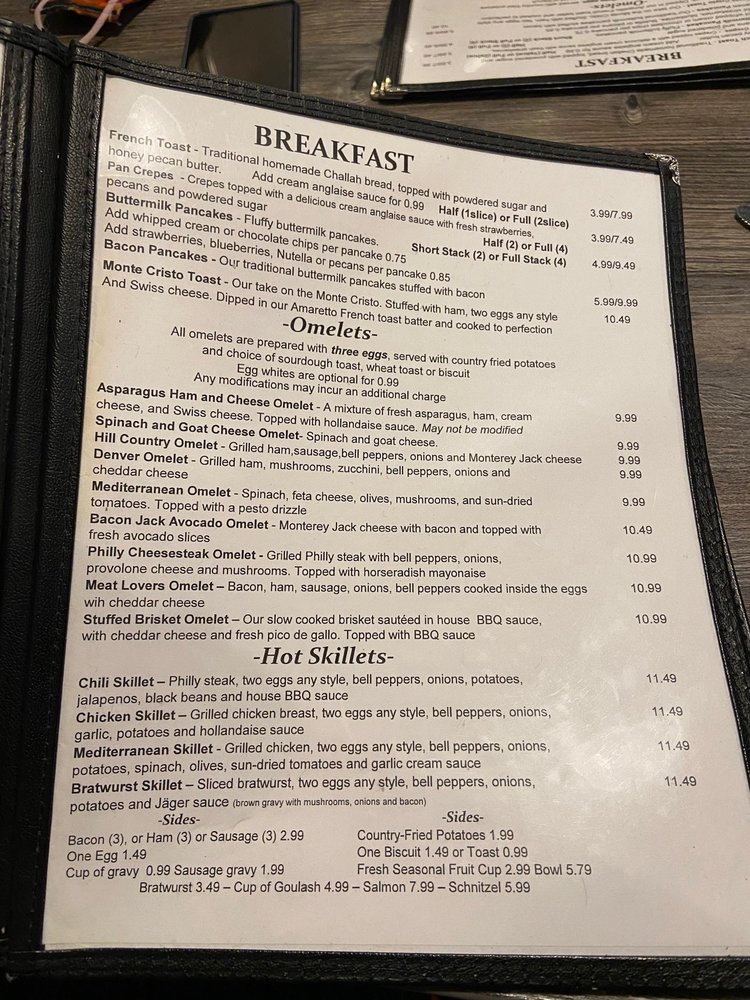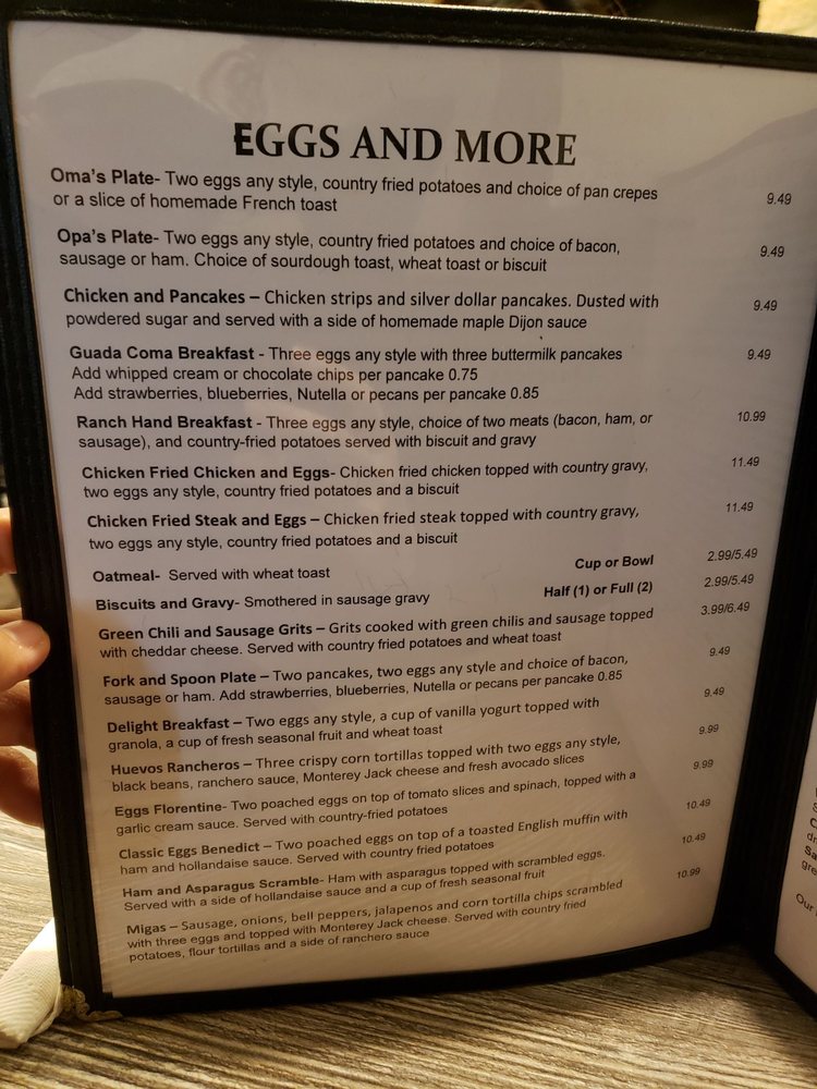 Two eggs any style, country fried potatoes and choice of pan crepes or a slice of homemade French toast