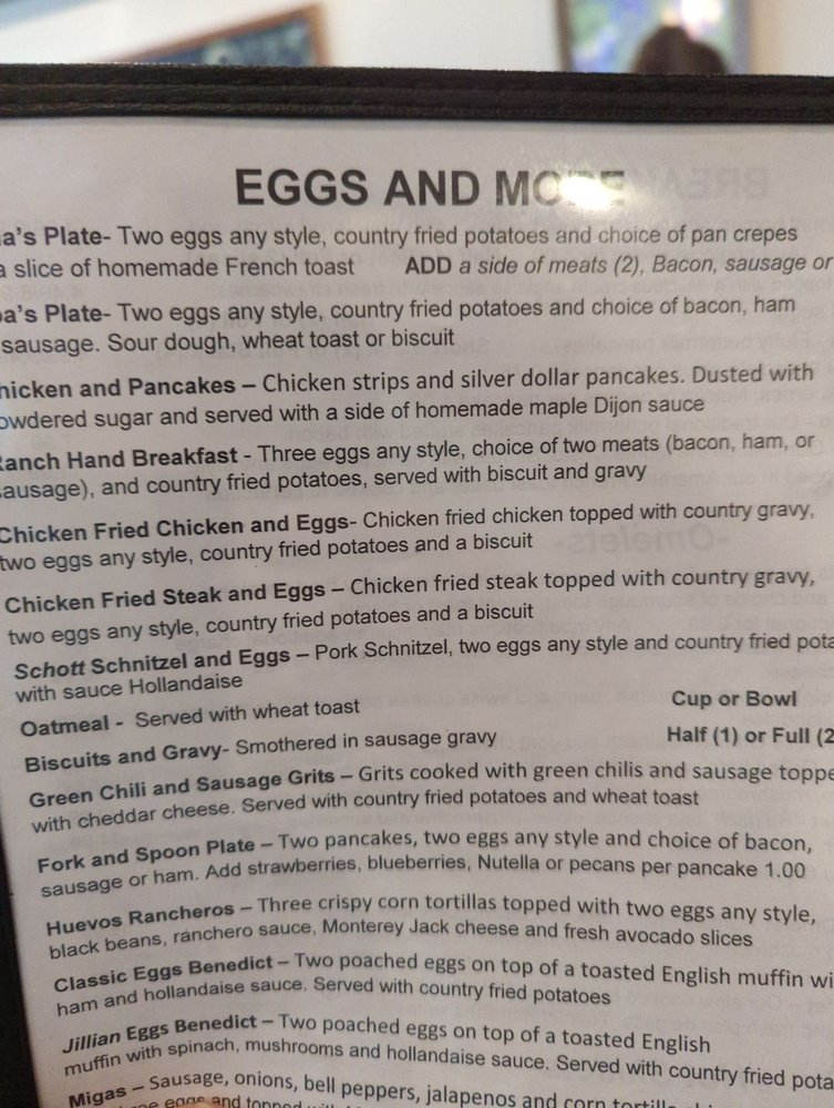 Two eggs any style, country fried potatoes and choice of bacon, ham or sausage. Sour dough, wheat toast or biscuit